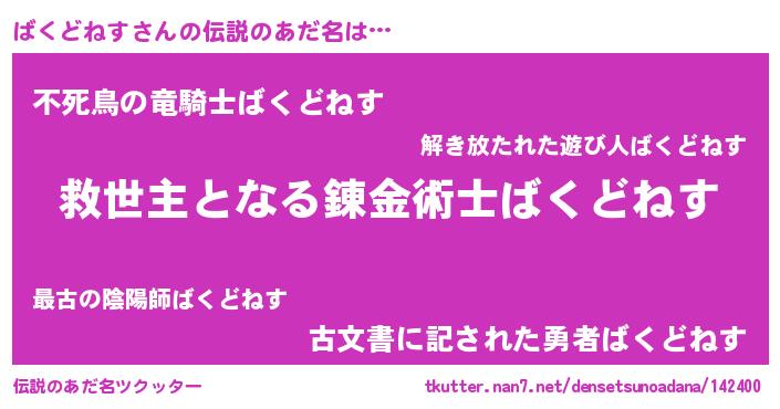 | 胡散臭い通販商品みたいなあだ名 | 『あなたにだけ特別に提供する世界で10本だけ現存している希少なブランデー…その名も「ばくどねす」』 |