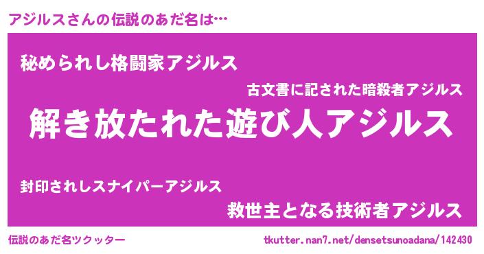 | 男性向けラノベタイトル風あだ名 | 『アジルスの嫁は女の子じゃないと思った?』 |