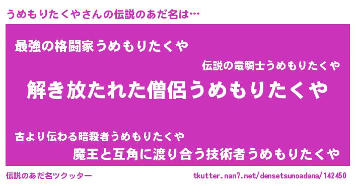 | ポケモン風あだ名 | 『ヒウメモリタクヤ』『ウメセウス』 |