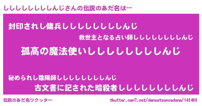 | 男性向けラノベタイトル風あだ名 | 『ダンジョンにししししししししんじを求めるのは間違っているだろうか』 |