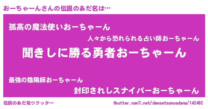 | 男性向けラノベタイトル風あだ名 | 『おーちゃーんという概念が存在しない退屈な世界 』 |