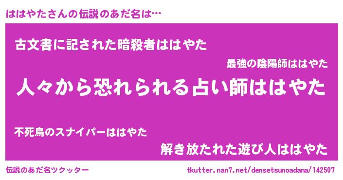 | ヒーロー風カッコイイあだ名 | 『正義の使者ははやた』『ネオハハヤタ』 |