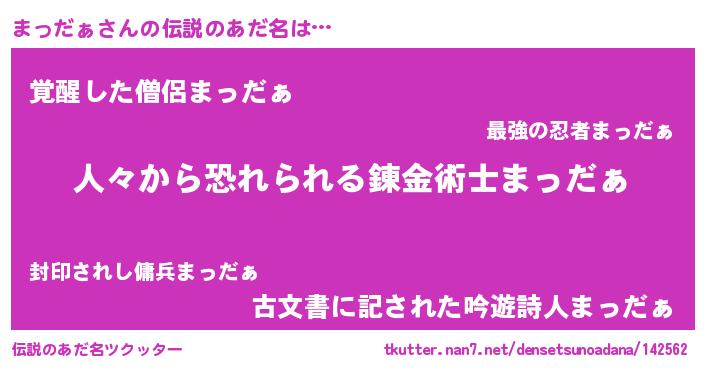 | 男性向けラノベタイトル風あだ名 | 『おまえをオタクにしてやるから、俺をまっだぁにしてくれ! 』 |