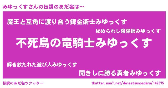 | 女子向けラノベタイトル風あだ名 | 『みゆっくす姫と円卓の騎士』 |