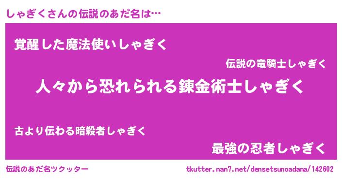 | 男性向けラノベタイトル風あだ名 | 『おまえをオタクにしてやるから、俺をしゃぎくにしてくれ! 』 |
