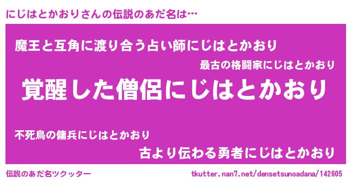 | 男性向けラノベタイトル風あだ名 | 『にじはとかおりの嫁は女の子じゃないと思った?』 |