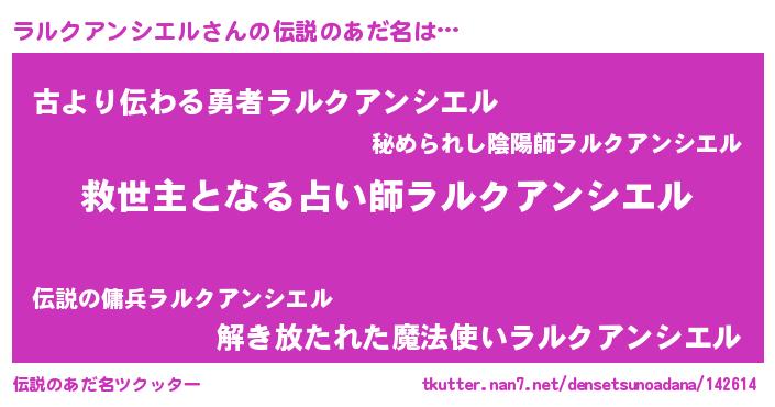 | 男性向けラノベタイトル風あだ名 | 『ノーゲーム・ノーラルクアンシエル』 |