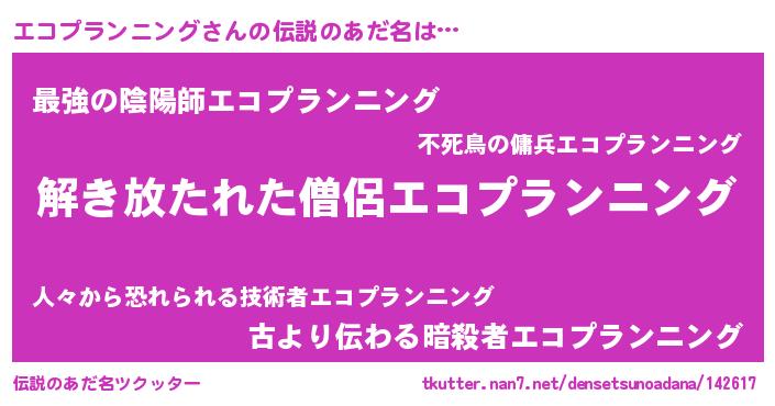 | 男性向けラノベタイトル風あだ名 | 『エコプランニングの嫁は女の子じゃないと思った?』 |