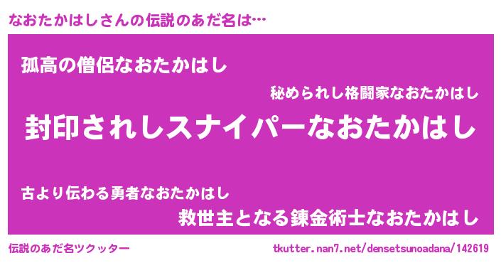 | 男性向けラノベタイトル風あだ名 | 『ナオタカハシアートオンライン』 |