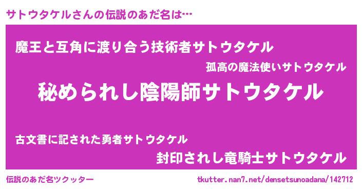 | ヒーロー風カッコイイあだ名 | 『仮面サトダー』『スーパーサトウタケル』 |