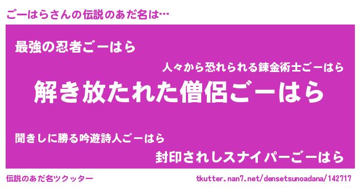 | 意味不明あだ名 | 『たけのこ科ごーはら属』『自称ごーはら』 |