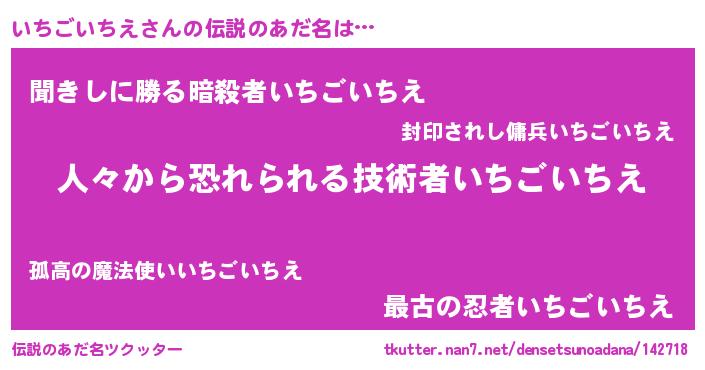 | 男性向けラノベタイトル風あだ名 | 『おまえをオタクにしてやるから、俺をいちごいちえにしてくれ! 』 |