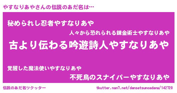 | 男性向けラノベタイトル風あだ名 | 『やすなりあやという概念が存在しない退屈な世界 』 |