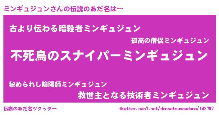| 胡散臭い通販商品みたいなあだ名 | 『モテモテ間違いなし霊験あらたかなお札…その名も「ミンギュジュン」』 |