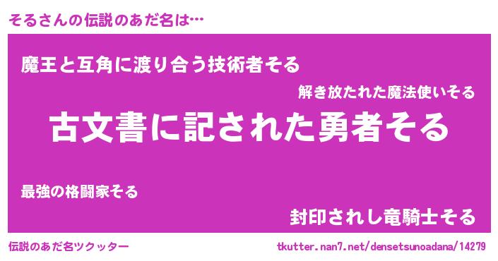 | 男性向けラノベタイトル風あだ名 | 『そる~年齢イコール彼女いない歴の魔法使い~』 |