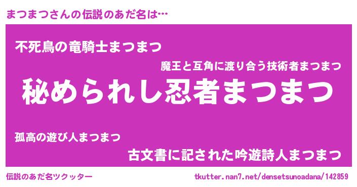 | 女子向けラノベタイトル風あだ名 | 『まつまつの雑貨屋さん』『闇のまつまつ』 |