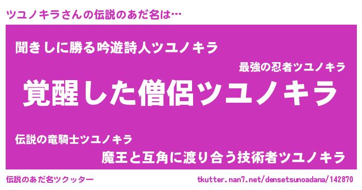 | 意味不明あだ名 | 『自称ツユノキラ』『永久保存ツユノキラ』 |