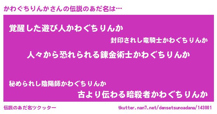 | 女子向けラノベタイトル風あだ名 | 『かわぐちりんかが死なない童話 林檎のかわぐちりんかの診療簿』 |