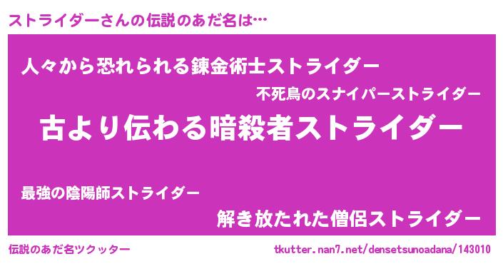 | 胡散臭い通販商品みたいなあだ名 | 『来世でも幸せになれる健康食品…その名も「ストライダー」』 |