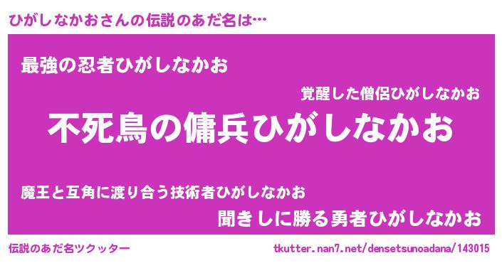| ヒーロー風カッコイイあだ名 | 『スーパーヒガシナカオ』『魔戒騎士ヒガ』 |