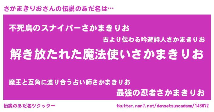 | 男性向けラノベタイトル風あだ名 | 『さかまきりおの嫁は女の子じゃないと思った?』 |