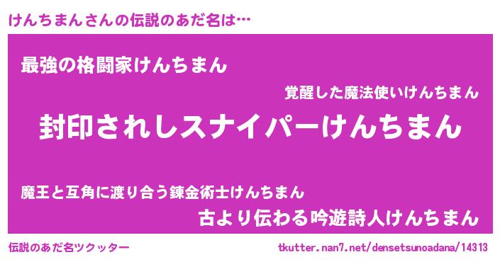 | 意味不明あだ名 | 『ペロリンけんちまん』『自称けんちまん』 |