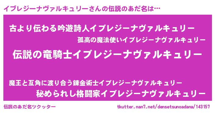 | 女子向けラノベタイトル風あだ名 | 『イブレジーナヴァルキュリーなんてお断りですっ。』 |