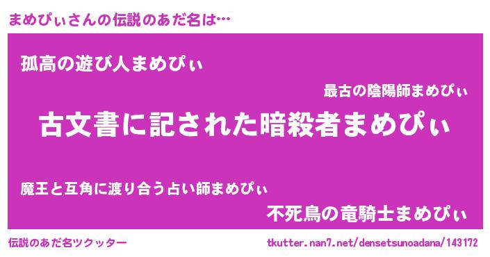 | 男性向けラノベタイトル風あだ名 | 『まめぴぃに滅ぼされるだけの簡単なお仕事です』 |