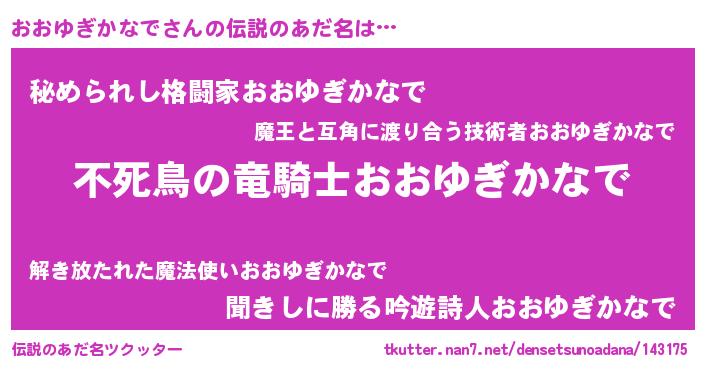 | 女子向けラノベタイトル風あだ名 | 『おおゆぎかなで姫と円卓の騎士』 |