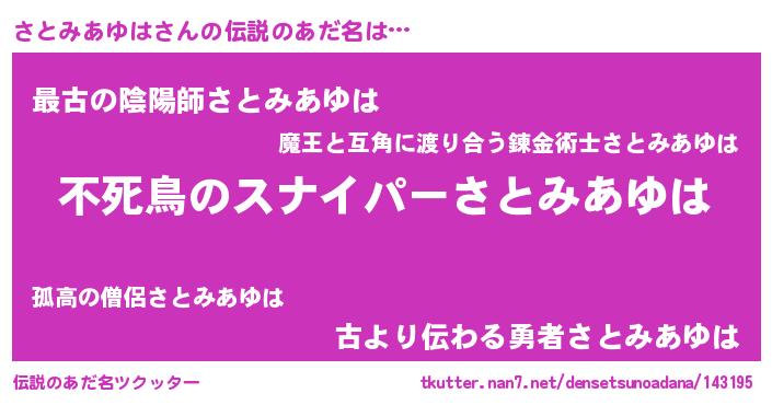 | 意味不明あだ名 | 『住所不定無職さとみあゆは(86歳)』 |