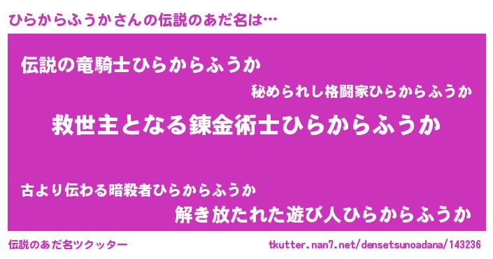 | 男性向けラノベタイトル風あだ名 | 『ノーゲーム・ノーヒラカラフウカ』 |