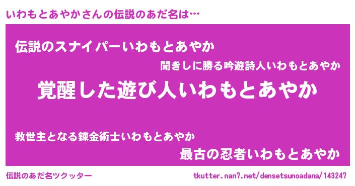 | 男性向けラノベタイトル風あだ名 | 『いわもとあやかの嫁は女の子じゃないと思った?』 |
