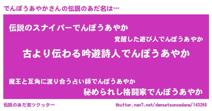 | ヒーロー風カッコイイあだ名 | 『ネオデンポウアヤカ』『仮面デンダー』 |