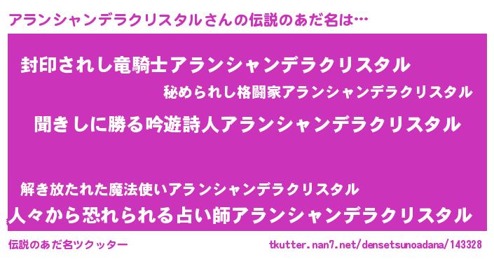 | 男性向けラノベタイトル風あだ名 | 『アランシャンデラクリスタルスレイヤー』 |