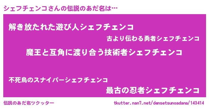 | 女子向けラノベタイトル風あだ名 | 『シェフチェンコ恋絵巻』 |