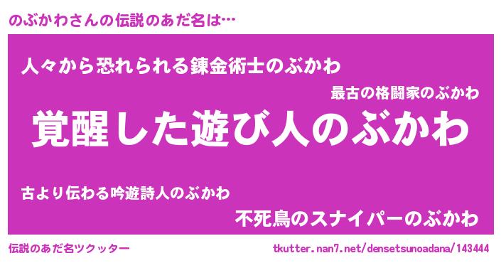 | 男性向けラノベタイトル風あだ名 | 『Re:のぶかわから始める異世界生活』 |