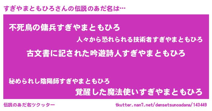 | 男性向けラノベタイトル風あだ名 | 『Re:すぎやまともひろから始める異世界生活』 |