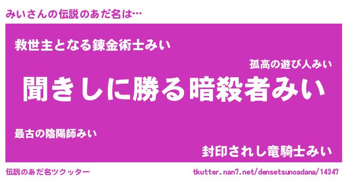 | 男性向けラノベタイトル風あだ名 | 『魔弾の王とみい』『はたらくみいさま!』 |