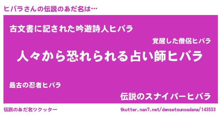 | ヒーロー風カッコイイあだ名 | 『ウルトラ戦士ヒバラ』『仮面ヒバダー』 |