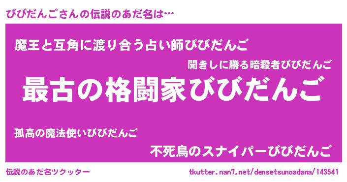 | ヒーロー風カッコイイあだ名 | 『最強戦士ビビダンゴ』『ネオビビダンゴ』 |