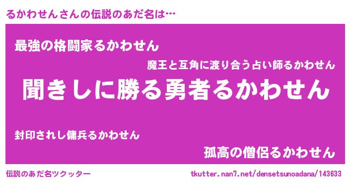 | 男性向けラノベタイトル風あだ名 | 『るかわせんという概念が存在しない退屈な世界 』 |