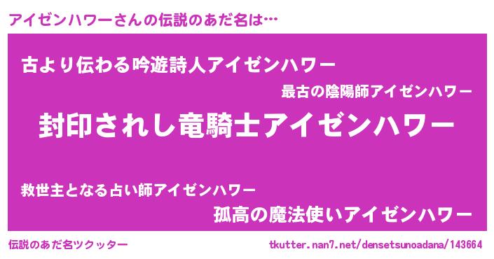 | 男性向けラノベタイトル風あだ名 | 『アイゼンハワー~年齢イコール彼女いない歴の魔法使い~』 |