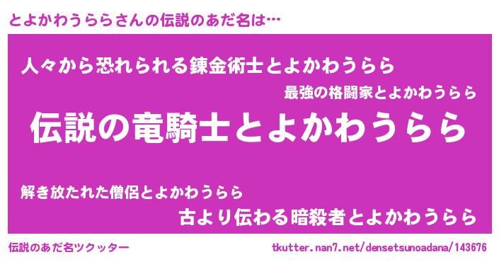 | 男性向けラノベタイトル風あだ名 | 『トヨカワウララスレイヤー』 |