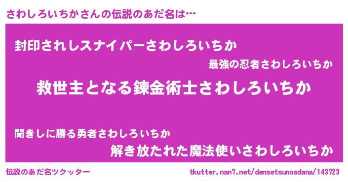 | 男性向けラノベタイトル風あだ名 | 『さわしろいちか~年齢イコール彼女いない歴の魔法使い~』 |