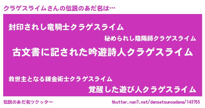 | 意味不明あだ名 | 『住所不定無職クラゲスライム(8歳)』 |