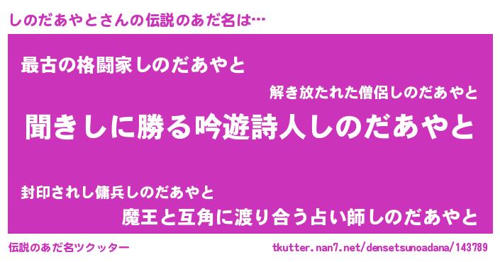 | 女子向けラノベタイトル風あだ名 | 『異世界で失敗しない100のしのだあやと』 |