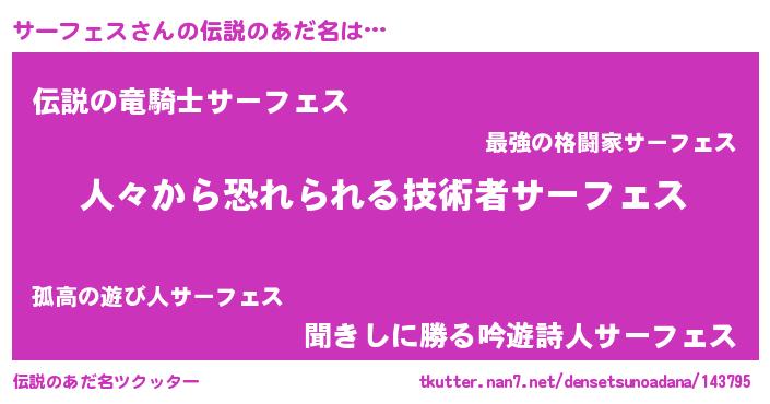 | ヒーロー風カッコイイあだ名 | 『正義の使者サーフェス』『仮面サーダー』 |