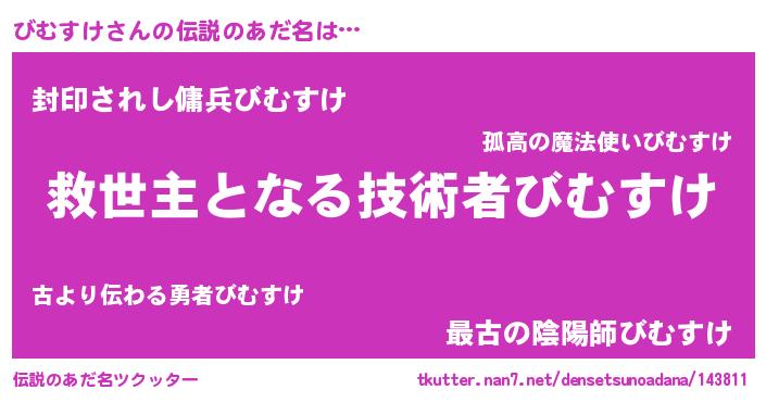 | 男性向けラノベタイトル風あだ名 | 『びむすけ~年齢イコール彼女いない歴の魔法使い~』 |