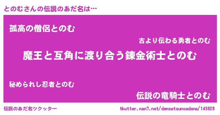 | 女子向けラノベタイトル風あだ名 | 『闇のとのむ』『とのむ夫妻のなれそめ』 |