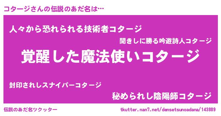 | ヒーロー風カッコイイあだ名 | 『天弓騎士コタ』『正義の使者コタージ』 |